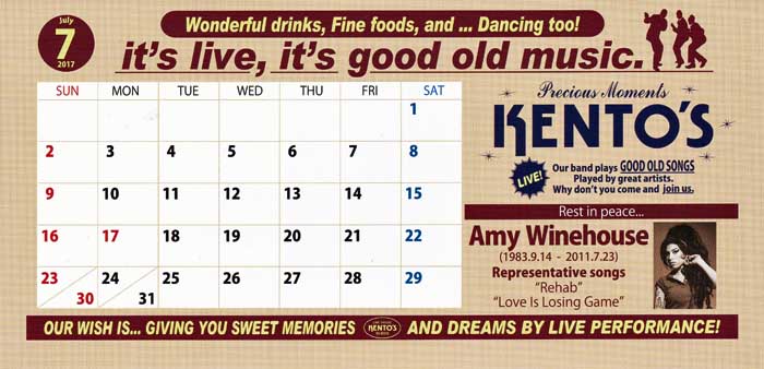 | この2017年ケントスカレンダーの7月画像は、松山のYさんから2017年9月3日に送って頂きました。右下側に次のような文章と写真が付いています。上から順に、Rest in peace Amy Winehouse (1983.9.14 - 2011.7.23) Represntative song "Rehab" "Love Is Losing Game" のようです。 上野流直訳で、「安らかにお眠り下さい。 エイミー・ワインハウス (生誕1983年9月14日 -死没 2011年7月23日) 代表曲は”Rehab”、”Love Is Losing Game”」でしょう。私は、この歌手の顔も曲も、エピソードなども、全く知りません。そのようなことから今回は、曲の感想、その他、色々と書くのはやめておきます。(掲載日:2017年12月11日) |