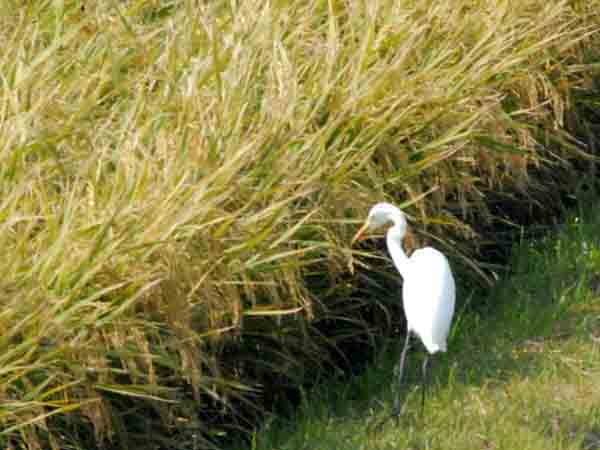 | この写真は、朝10時頃に稲穂を食べているような白鷺を撮ったものです。なぜ「稲穂を食べているような」と書いているのかと言いますと、動作が速すぎて望遠レンズで、とらえきれなかったからです。あと私は白鷺の生態を良く知らないので、穀物類も食べるのかどうか分かっていません。当然、小魚、虫などは好物でしょうが。ただ、雑食性があるようです。 稲穂が黄金色になる頃、私は度々このような田んぼで白鷺を見かけます。下記の写真<(1)白鷺(しらさぎ)の落穂拾い>、<(3)あぜ道歩きの白鷺>には、虫も探しているようですが、米なども食べているのではないかと思います。 いずれにしても、白鷺は(これだけ人間が地球や地域環境を悪くしても)なかなか、どうしてや何でも食べて生き抜いている感じもします。ただ、私の学生時代頃よりは、本当に数は激減しています。白鷺や野鳥が住めない環境ばかりになって、果たして人だけは大丈夫と言うのでしょうか。(掲載日:2006年10月3日) |
