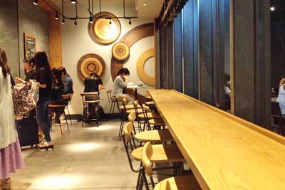 熊本駅店のオープン後、約8か月経ってから大分県へ撮影目的もあって、また熊本経由で行ってみようという気が起こりました。(念のため、長崎県大村市から熊本市に立ち寄り、その後、大分へ向かうのは大幅な遠回りになります) 2019年7月当時、熊本県には、スターバックス店が10店ありましたので、今まで行っていない店にも行けば全店達成ともなりました。 熊本駅は、九州新幹線やJR鹿児島本線の駅です。私は、泊まっていたホテルや市電利用のため、この駅の白川口(東口)しか知りませんが、その駅舎1階の通り口にスターバックス・熊本駅店があります。店の場所は、例えば市電・バス・タクシーで駅へいらっしゃった方が、東口から駅構内へ進まれる場合、ほぼ全員がスタバ店の玄関前を通られる大変便利な所です。分かりやすい表現ならば、店の場所としては、”一等地”でしょう。 このスタバ店の東側(市電側)は、テラス席があります、また、その内側(室内)席(カウンター席)の前は、ほぼ全面ガラス張りの造りです。(この詳細は後の項目に書く予定) 店内は玄関側に会計や陳列ケースがあり、そして室内席は、けっこう奥までありました。 ここからは、あくまでも私の見た目や店内にいた時間帯だけの話ですが、手に旅行鞄か、リュックを持った旅行者が目につきました。ただ、駅を通学や通勤に利用されているのか、地元の学生・サラリーマンの方も、それ以上に多かったようでした。 カウンター席から市電など眺めながらのコーヒー この店の玄関から見れば左側が注文カウンターで、その奥はカウンター席でした。また、店内奥側の壁には、(右下1番目写真参照)独楽(こま)の上部のようにも見える木製風デザインが飾ってありました。あと、右側で外が見える広いガラス窓がある所は、カウンター席でした。なお、ガラス窓の外側に、テラス席も何席かありました。