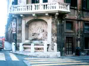 段々、水音が大きく聞こえるようになって、右側にビル街の合間から、まず、人だかりと広場が見えてきました。さらに後方に目を転じると、ポーリ宮殿を背景にした泉全体が目に入りました。 まだ、朝なので泉も宮殿も日陰ばかりで「光線の具合が悪いね。もう1回昼間に来ようかね」、「朝は、まだ観光客も少ないけど、昼間来たら一杯だろうなあ」とも言っていました。と、言うことで、朝の見学はさっと見る程度にして、泉の前で腰掛けて背後からドードーという水音を聞いていました。 次に向かう場所に行くため立ち上がり、今度はこの泉の左側からトリトーネ通りに出ました。さらに下ると10年前泊まった『ホテル・トリトーネ』が見えてきました。「あっ、あのままだ。あの時はあの3階の左端の部屋だったと思う。入口は小さいが部屋の中はマアマアで、金網の小さなエレベターがあったよ」と、言うと義兄ががビデオをゆっくりまわし始めました。 |
